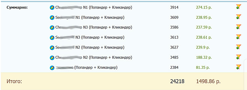 Полностью скрин не привожу, т.к. я там пытался на тизеры лить на моих сайтах, но ничего кроме прироста посещалки не получил. Из приведенной статы можно вычесть 2400 ушедших на сторону, все остальное лилось на три разных офера двух сайтов.