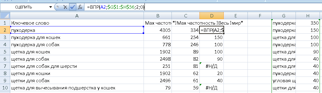 имеем 2 комплекта данных по ключам, в одном две колонки со списком ключей с Яндекса, в другом тоже самое, но с Google. Ключи использовались одни и те же, но на выходе получалось, что с Google ключей меньше, т.ч надо было отыскать соответствие в колонках Яндекса по полю ключа и при совпадении поставить значение частотности из колонок Google.
