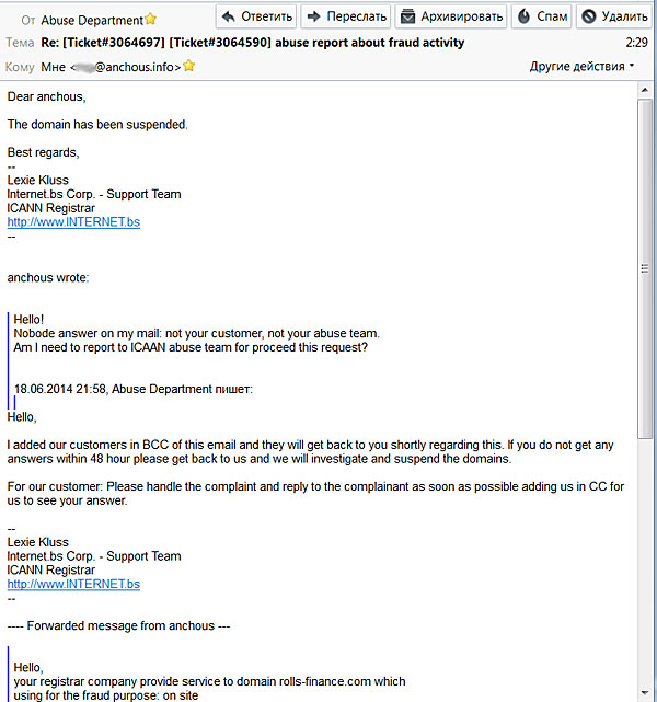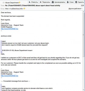Но неожиданно, 18 июня мне упало письмо о том, что Abuse Department Internetbs.net понимает и разделяет мои страдания и этим письмо уведовляет своего клиента, владельца домена rolls-finance.com о том, что людей кидать не хорошо и по этой причине они, с нетерпением, ждут пневматичного письма от него с объяснениями. Если же оных не последует, то домен будет засуспенден.