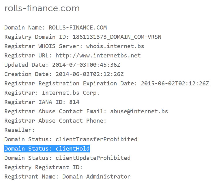 ClientHold фактически означает, что домен снят с делегирования и к тому же запрещен его трансфер и обновление данных в реестре зоны. Причем, как можно заметить, домен был заблокирован без решения суда и довольно оперативно. Полагаю, что если бы я сам не прокладывал болта на переписку, то смог бы уложиться и в две недели, обещанных админу rolls-finance.com.