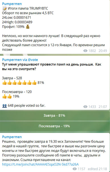 Админ, тем временем, уже форсил свой памп канал, где при достижении порога в 2к человек обещал людям золотой дождь.