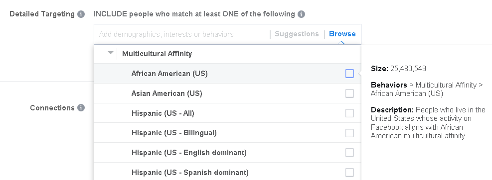 Начинаю ломать голову как это сделать и выпадаю осадок от того, что в штатовских аудиториях можно тупо таргетнуть на афроамериканцев или азиатов или латиносов, причем последних с выбором основного языка.