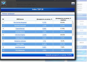 И вот в том году, набрел совершенно случайно на интересный вариант довольно нового инвестиционного портфеля от компании FOREX-MMCIS – Индекс ТОП20, в котором счет распределяется между 20 наиболее успешными трейдерами системы и конечный итог суммируется, давая не плохие барыши и минимизируя шанс потери депозита. Причем минимальный вклад всего $100. То есть фактически это доверительное управление Форекс, с минимальным порогом входа и максимальной диверсификацией рисков.